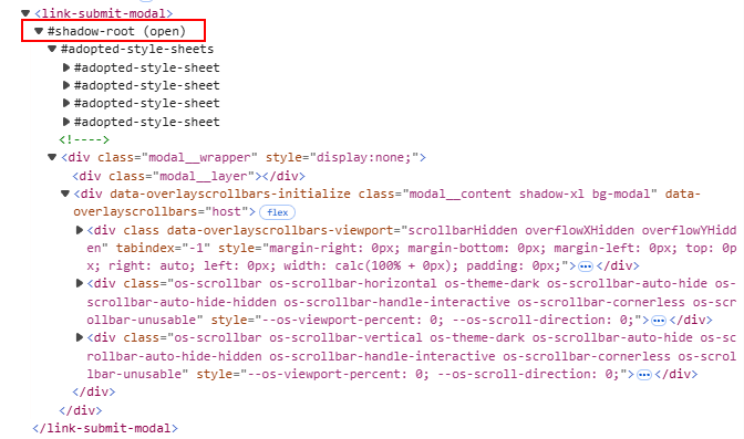 1.Shadow DOM在确定的时机创建/显示。例如这个组件的调用:<a href="javascript:;" onclick="LinkSubmitWidget.open()"...,只有点击了提交按钮,组件才会处理和显示Shadow DOM。这种情况我们可以监听这个按钮的点击事件,在组件处理完Shadow DOM后对其进行修改: