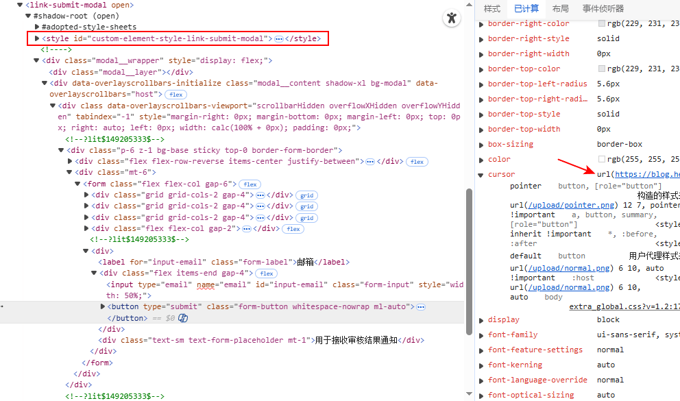 在修改博客样式时,发现自定义的样式在有个组件的弹窗界面不生效,即使写了!important也是如此,会被浏览器默认样式和“构造的样式表”覆盖。看了一下DOM结构,发现此组件的弹窗界面使用的是Shadow DOM,它相对独立,不容易受到外部样式的影响